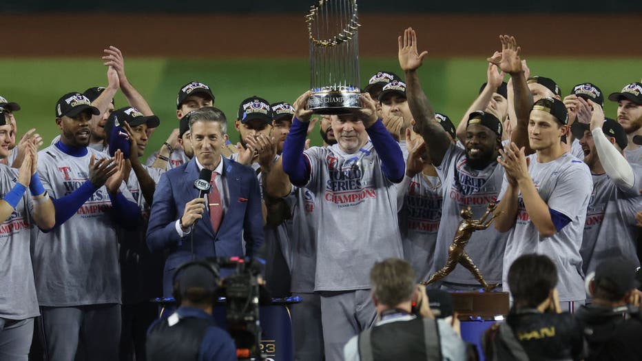 PHOENIX, ARIZONA - NOVEMBER 01: Manager Bruce Bochy of the Texas Rangers hoists the Commissioner's Trophy after the Texas Rangers beat the Arizona Diamondbacks 5-0 in Game Five to win the World Series at Chase Field on November 01, 2023 in Phoenix, A