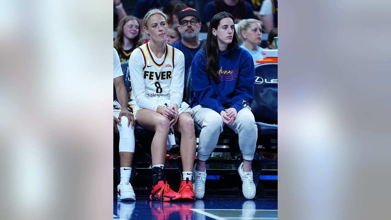 INDIANAPOLIS, IN - JUNE 26: Indiana Fever guard Sophie Cunningham and guard Caitlin Clark who is out with injury reacts look dejected on the sidelines as the Fever loses against the Los Angeles Sparks on June 26, 2025, at Gainbridge Fieldhouse in Ind