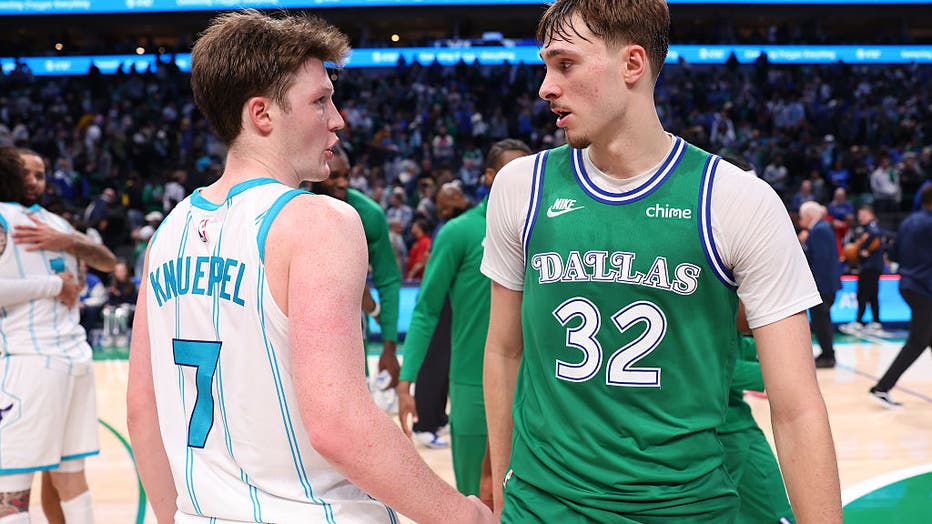 DALLAS, TEXAS - JANUARY 29: Cooper Flagg #32 of the Dallas Mavericks and Kon Knueppel #7 of the Charlotte Hornets talk after the game at American Airlines Center on January 29, 2026 in Dallas, Texas. NOTE TO USER: User expressly acknowledges and agre