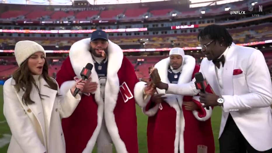 Prescott and Turpin were dressed in oversized Santa coats as they took big bites out of a tomahawk steak on the field.