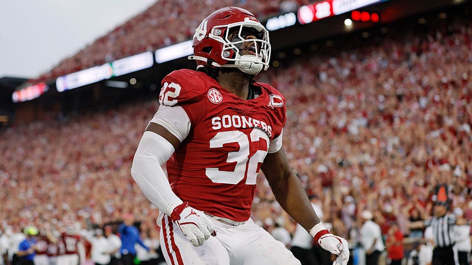 NORMAN, OKLAHOMA - SEPTEMBER 20: Defensive end R Mason Thomas #32 of the Oklahoma Sooners celebrates after sacking quarterback Jackson Arnold of the Auburn Tigers for a safety on 4th-and-29 late in the fourth quarter at Gaylord Family Oklahoma Memori