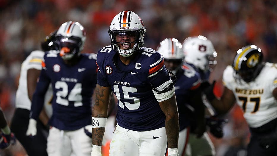 AUBURN, ALABAMA - OCTOBER 18: Keldric Faulk #15 of the Auburn Tigers reacts during the first half against the Missouri Tigers at Jordan-Hare Stadium on October 18, 2025 in Auburn, Alabama. (Photo by Justin Ford/Getty Images)