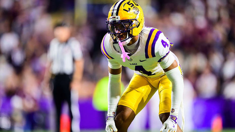 BATON ROUGE, LA - OCTOBER 25: Mansoor Delane #4 of the LSU Tigers in action against the Texas A&M Aggies at Tiger Stadium on October 25, 2025 in Baton Rouge, Louisiana. (Photo by Gus Stark/LSU/University Images via Getty Images)