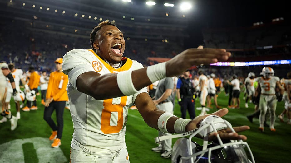 GAINESVILLE, FLORIDA - NOVEMBER 22: Colton Hood #8 of the Tennessee Volunteers celebrates after defeating the Florida Gators 31-11 in a game at Ben Hill Griffin Stadium on November 22, 2025 in Gainesville, Florida. (Photo by James Gilbert/Getty Image