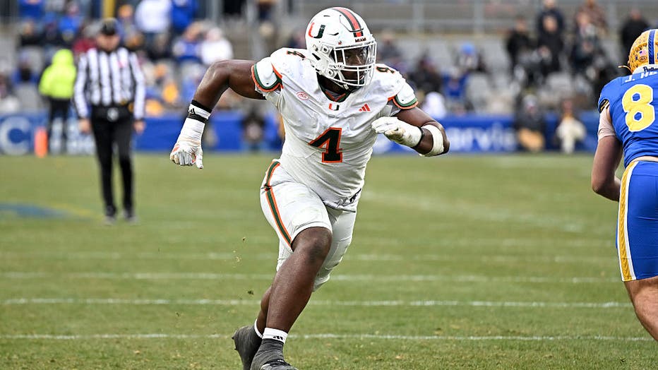 PITTSBURGH, PENNSYLVANIA - NOVEMBER 29, 2025: Rueben Bain Jr. #4 of the Miami Hurricanes rushes the line of scrimmage during the second half against the Pittsburgh Panthers at Acrisure Stadium on November 29, 2025 in Pittsburgh, Pennsylvania. (Photo