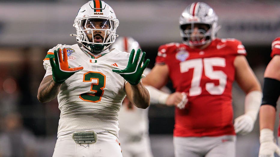 ARLINGTON, TX - DECEMBER 31: DL Akheem Mesidor #3 of the Miami Hurricanes reacts after a play against the Ohio State Buckeyes on December 31st, 2025 during the College Football Playoff Quarterfinal at the Goodyear Cotton Bowl Classic between the Miam
