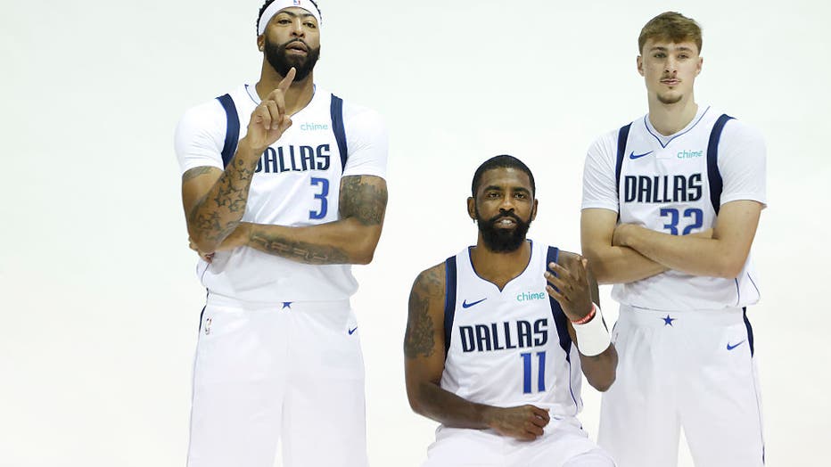 DALLAS, TEXAS - SEPTEMBER 29: Dallas Mavericks players Anthony Davis #3, Kyrie Irving #11 and Cooper Flagg #32 stand for a photo during Dallas Mavericks media day at American Airlines Center on September 29, 2025 in Dallas, Texas. NOTE TO USER: User