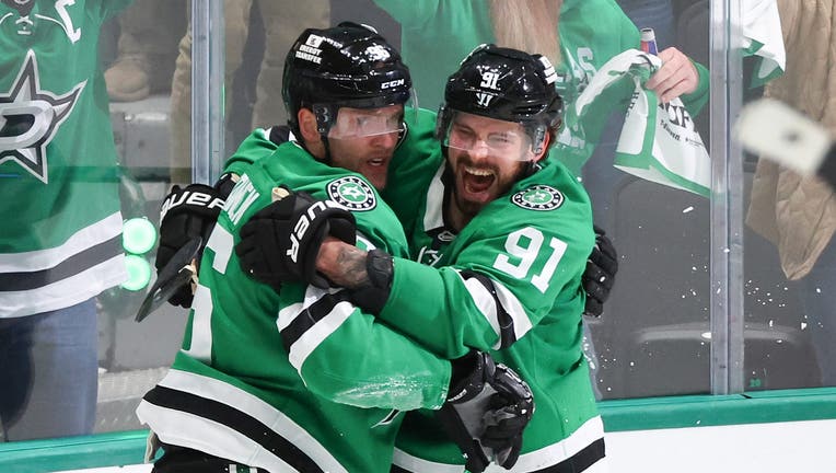 DALLAS, TEXAS - MAY 03: Mikko Rantanen #96 of the Dallas Stars is congratulated by Tyler Seguin #91 after scoring the game-tying goal against the Colorado Avalanche during the third period in Game Seven of the First Round of the 2025 Stanley Cup Play