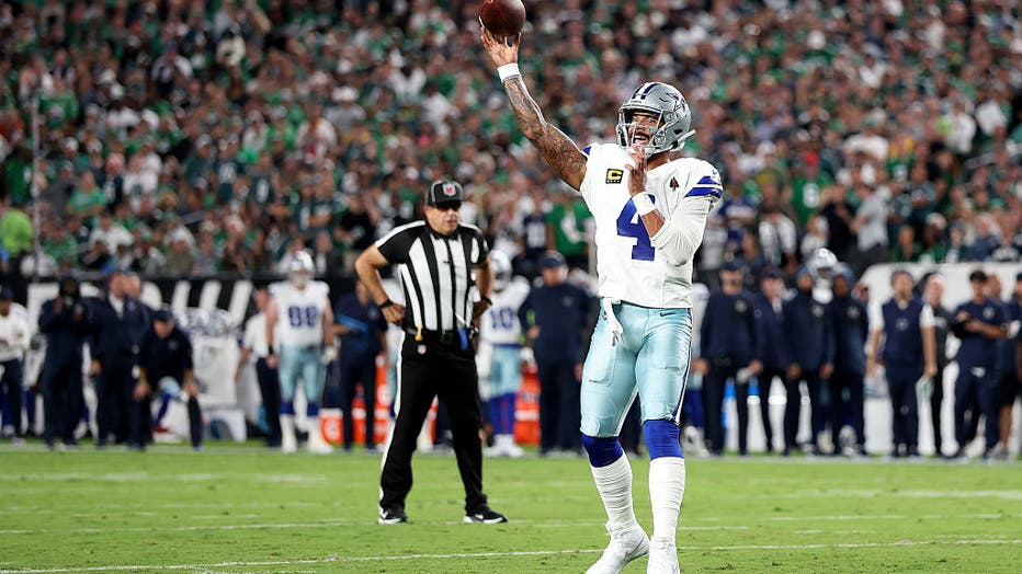 PHILADELPHIA, PENNSYLVANIA - SEPTEMBER 04: Dak Prescott #4 of the Dallas Cowboys throws a pass against the Philadelphia Eagles during the first quarter in the game at Lincoln Financial Field on September 04, 2025 in Philadelphia, Pennsylvania. (Photo