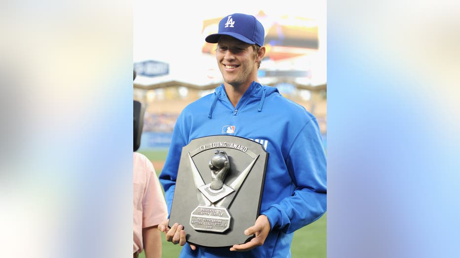 LOS ANGELES, CA - APRIL 09: Los Angeles Dodger pitcher Clayton Kershaw poses the 2013 Cy Young award presented to him before the game between the Detroit Tigers and the Los Angeles Dodgers at Dodger Stadium on April 9, 2014 in Los Angeles, California