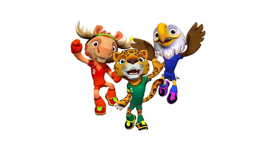 Canada’s Maple the Moose, Mexico’s Zayu the Jaguar, and the USA’s Clutch the Bald Eagle (FIFA)