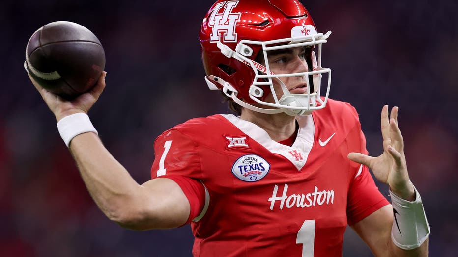Conner Weigman #1 of the Houston Cougars warms up before the game against the Louisiana State Tigers during the Kinder's Texas Bowl at NRG Stadium on December 27, 2025, in Houston, Texas. (Photo by Tim Warner/Getty Images)