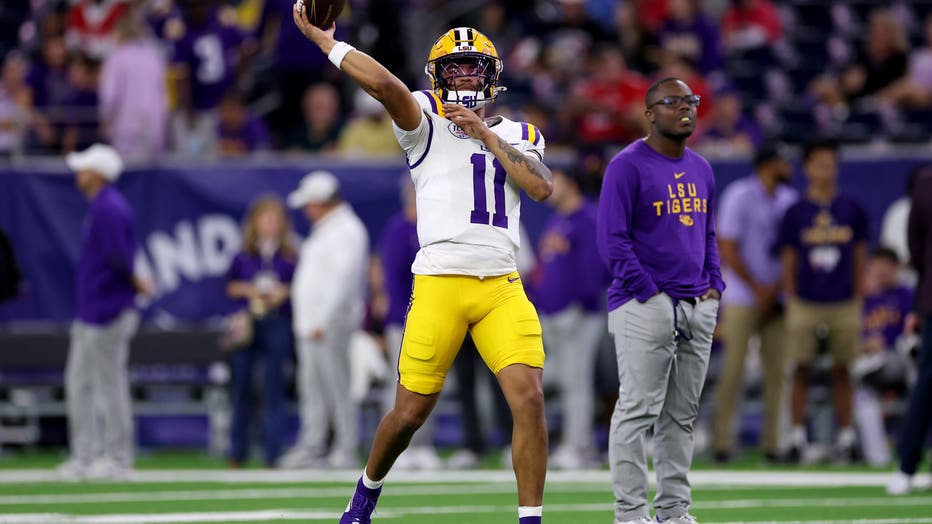 Michael van Buren Jr. #11 of the Louisiana State Tigers warms up before the game against the Houston Cougars during the Kinder's Texas Bowl at NRG Stadium on December 27, 2025, in Houston, Texas. (Photo by Tim Warner/Getty Images)