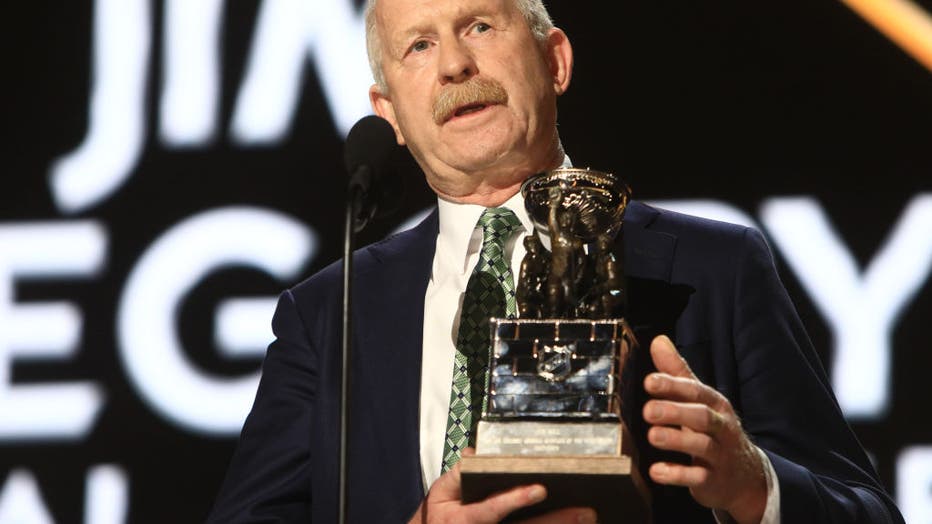 NASHVILLE, TN - JUNE 28: Jim Nill of the Dallas Stars addresses the audience after winning the Jim Gregory General Manager of the Year Award during the first round of the 2023 Upper Deck NHL Draft, held on June 28, 2023, at Bridgestone Arena in Nashv
