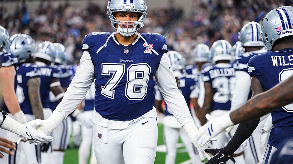 ARLINGTON, TX - DECEMBER 21: Terence Steele #78 of the Dallas Cowboys runs out of the tunnel prior to an NFL football game against the Los Angeles Chargers at AT&T Stadium on December 21, 2025 in Arlington, Texas. (Photo by Cooper Neill/Getty