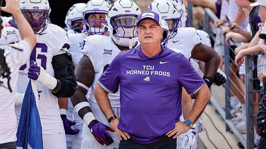 FORT WORTH, TX - SEPTEMBER 20: TCU Horned Frogs head coach Sonny Dykes waits to run out onto the field before the game between the TCU Horned Frogs and the Southern Methodist Mustangs on September 20, 2025 at Amon G. Carter Stadium in Fort Worth, Tex