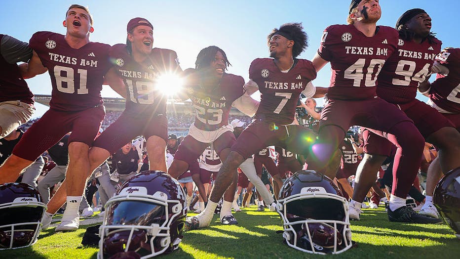COLLEGE STATION, TEXAS - NOVEMBER 15: Texas A&M Aggies celebrate their 31-30 win over the South Carolina Gamecocks at Kyle Field on November 15, 2025 in College Station, Texas. (Photo by Alex Slitz/Getty Images)