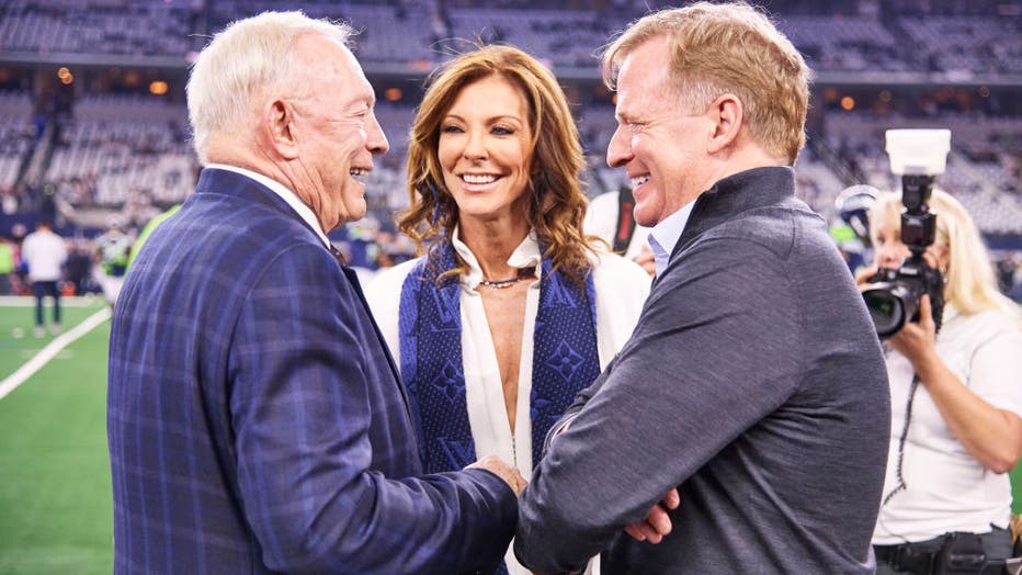 Football: NFC Playoffs: Closeup of Dallas Cowboys executive vice president Charlotte Jones-Anderson with father and Cowboys owner Jerry Jones (L) and NFL commissioner Roger Goodell on field before game vs Seattle Seahawks at AT&T Stadium.Arli