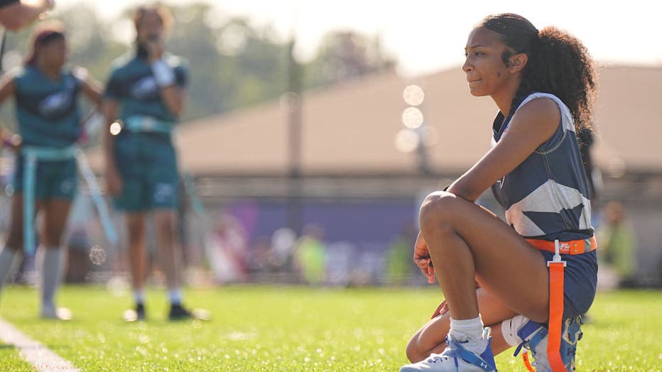 Flag Football: A young girl in action, kneels and rests during the 2024 Flag Football Championships at Hall of Fame Village.Canton, OH 7/20/2024CREDIT: Erick W. Rasco (Photo by Erick W. Rasco/Sports Illustrated via Getty Images) (Set Number: X164542)
