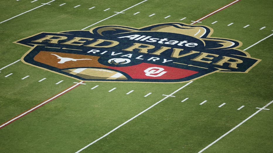 DALLAS, TEXAS - OCTOBER 12: A general view of the Red River Rivalry logo at Cotton Bowl Stadium on October 12, 2024 in Dallas, Texas. (Photo by Alex Slitz/Getty Images)