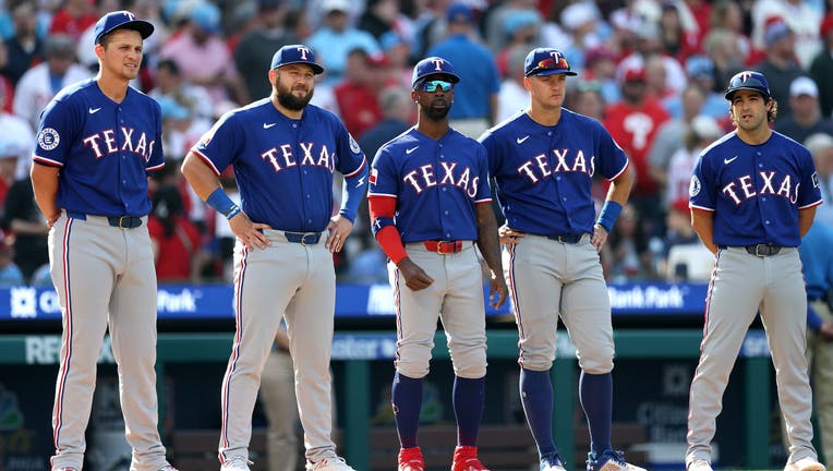 PHILADELPHIA, PENNSYLVANIA - MARCH 26: The Texas Rangers stand on the line for introductions on Opening Day against the Philadelphia Phillies at Citizens Bank Park on March 26, 2026 in Philadelphia, Pennsylvania. (Photo by Emilee Chinn/Getty Images)