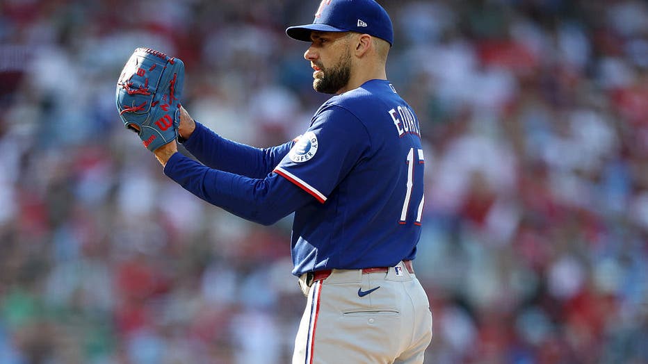 PHILADELPHIA, PENNSYLVANIA - MARCH 26: Nathan Eovaldi #17 of the Texas Rangers pitches in the first inning against the Philadelphia Phillies on Opening Day at Citizens Bank Park on March 26, 2026 in Philadelphia, Pennsylvania. (Photo by Emilee Chinn/