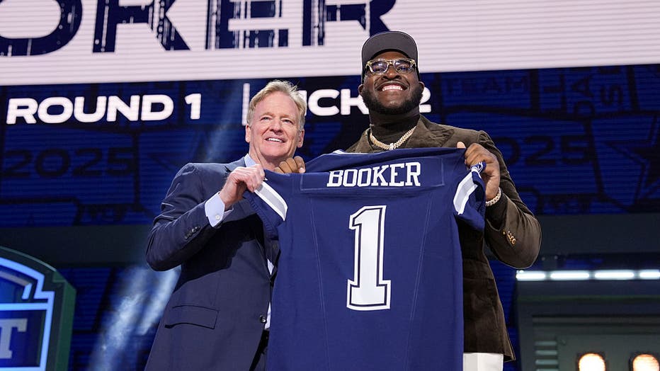 GREEN BAY, WISCONSIN - APRIL 24: Alabama offensive lineman Tyler Booker and Commissioner Roger Goodell pose after being selected 12th overall by the Dallas Cowboys during the first round of the 2025 NFL Draft on April 24, 2025 in Green Bay, Wisconsin