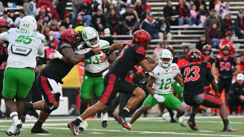 ALBUQUERQUE, NEW MEXICO - DECEMBER 27: Quarterback Bert Emanuel Jr. #5 of the San Diego State Aztecs rushes for a 72-yard touchdown against the North Texas Mean Green during the first half of the Isleta New Mexico Bowl at University Stadium on Decemb