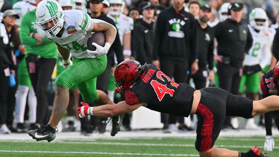 ALBUQUERQUE, NEW MEXICO - DECEMBER 27: Running back Caleb Hawkins #24 of the North Texas Mean Green scores a touchdown against edge rusher Brady Nassar #33 of the San Diego State Aztecs during the first half of the Isleta New Mexico Bowl at Universit