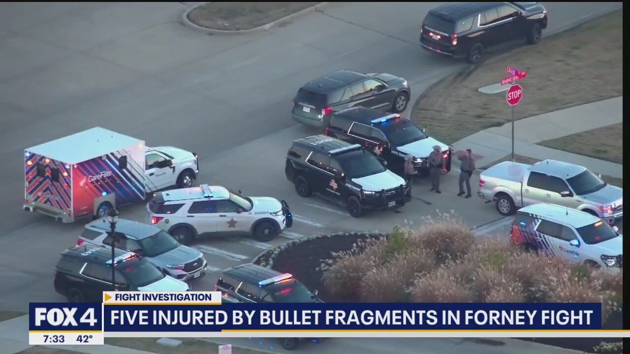 The Kaufman County Sheriff's Office says someone tried to take a gun out of an officer's holster during a fight. The gun discharged and bullet fragments flew, causing 5 injuries in Forney.