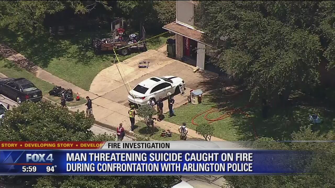 Three Arlington police officers and a suicidal man they were trying to help were hospitalized after the man caught on fire Monday afternoon.