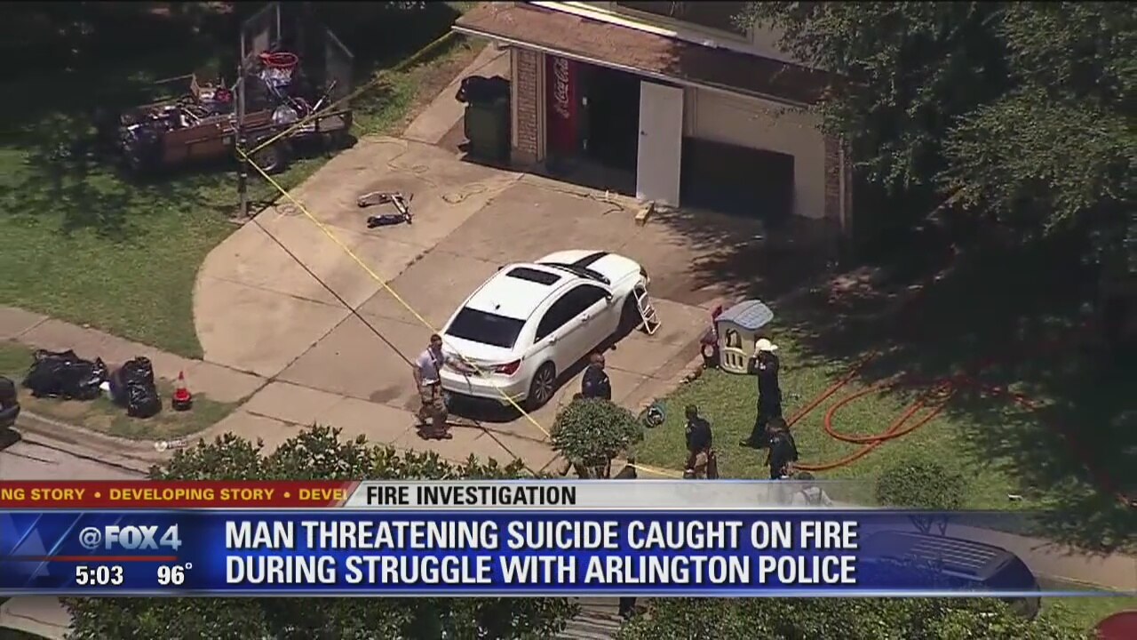Arlington police say a man who was threatening suicide doused in gasoline and holding a lighter was critically burned when he caught fire.
