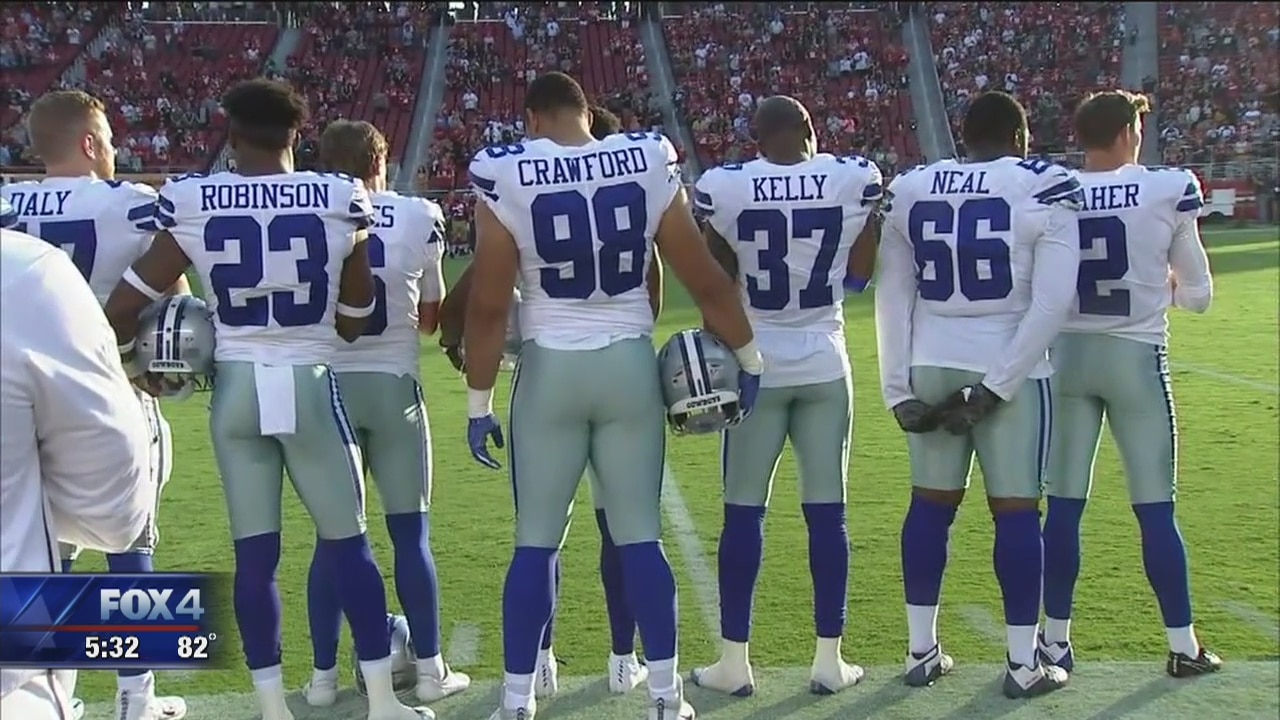 Cowboys stand during anthem; other players protest