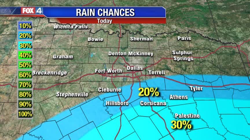 Clouds will be slowly heading out (except SE where a few showers linger) and temps will stay in the 80s for a few days! That moisture will still hang around south and east of the DFW area all week...so while most won't see rain, we can't take it out of the forecast altogether...
