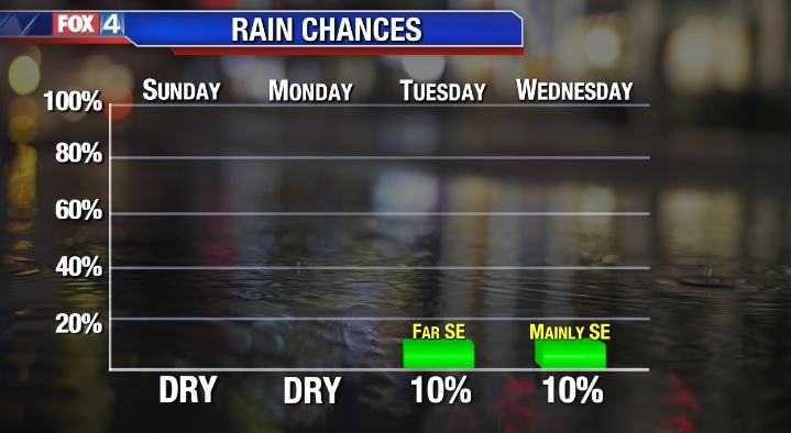 Upper 90s continue to end the weekend. While temperatures drop a few degrees next week, North Texas will remain above normal for this time of year. Low rain chances return, mainly SE of DFW starting Tuesday.