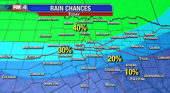 Rain chances are highest today, but will be most likely in areas north of DFW. High pressure remains our dominant weather feature, which means no heat relief in sight. Expect low 90s each afternoon across North Texas.