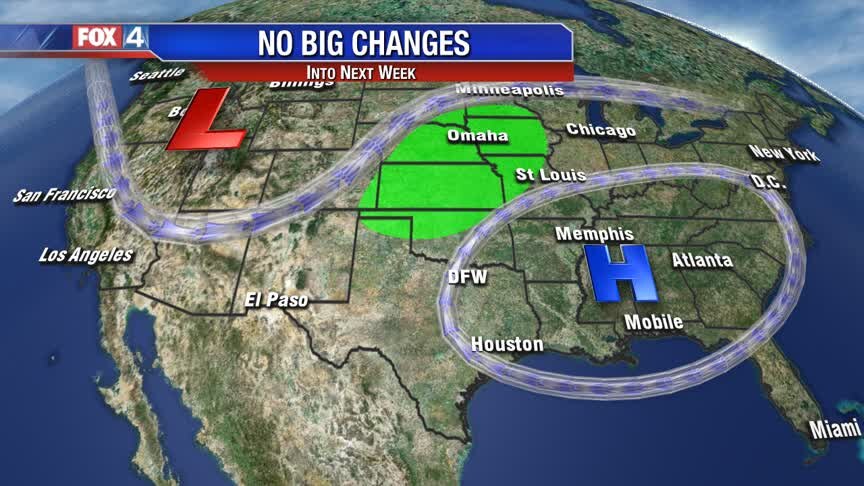 A stagnant weather pattern is in place for several more days. That means low rain chances and well above normal temperatures continue across North Texas.