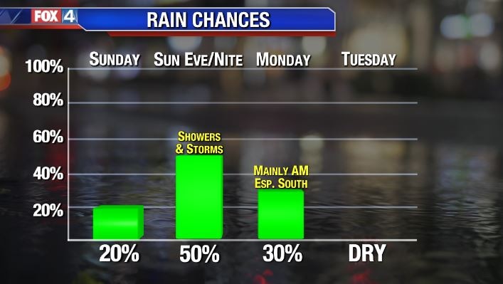 Our long-awaited cold front is on the way late Sunday. Ahead of it, hot conditions persist. Scattered showers and storms develop Sunday evening and into the overnight, as the front moves through North Texas. Behind the front, a strong north wind ushers in noticeably cooler conditions to start the work week. A slow warm up ensues next week, before another cold front brings more rain chances and cooler air to end next week.