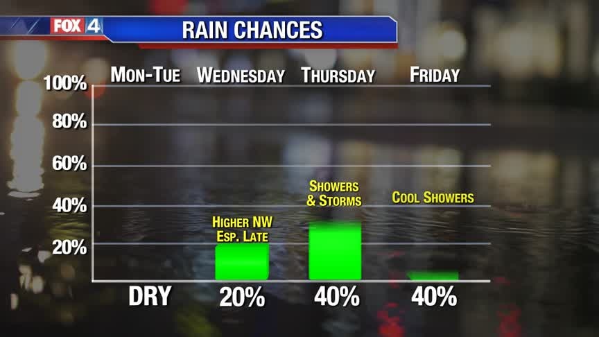Sunshine and mild temperatures continue for the next couple of days. Mid-week, clouds and low rain chances return ahead of the next storm system. Scattered showers and storms move through with a cold front Thursday. Rain chances linger into Friday, as temperatures cool off. We dry out just in time for the weekend.