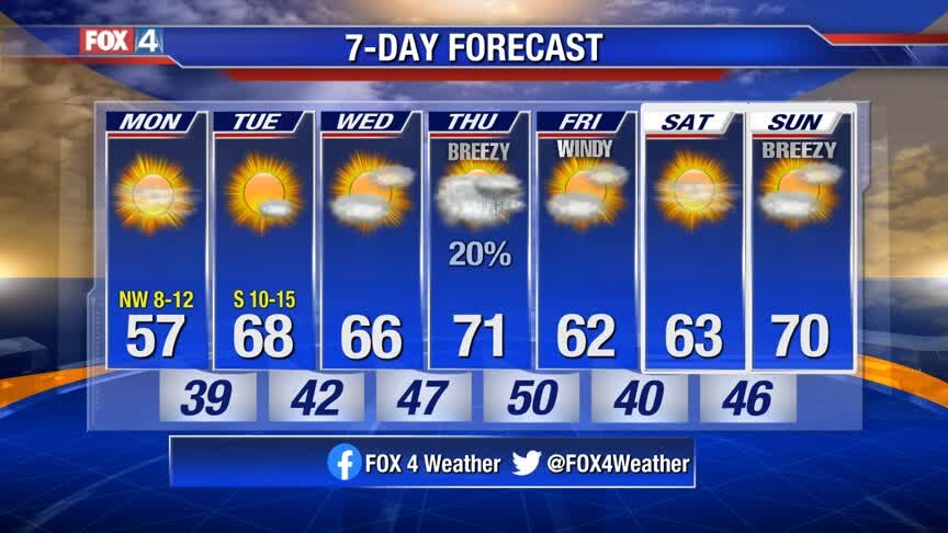 Pleasant conditions for the next several days and comfy temperatures as well! Only chance for rain is Thursday, and not too promising. Make the most of the nice weather. #fox4weather