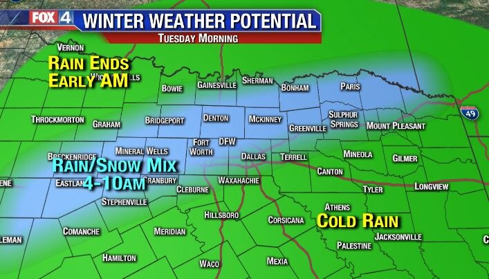 Temperatures quickly drop into the 30s and 40s tonight, as a disturbance brings widespread precipitation. A cold rain will increase from west to east, especially after midnight. There is potential for a rain and snow mix between 4-10am along a line from Stephenville northeast to Paris. Surface temperatures stay above freezing through this time period, keeping accumulations to a minimum and on grassy surfaces only. Behind this system, we dry out and slowly warm up through the rest of the week.