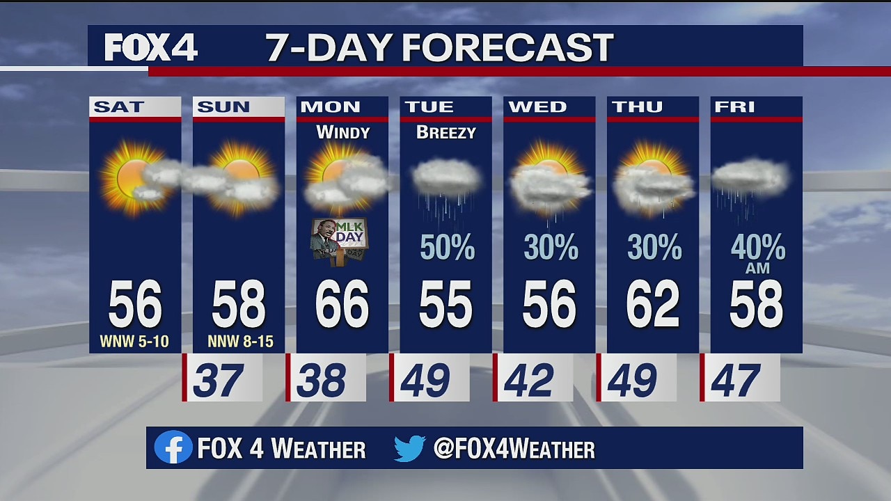 It should be a mild weekend, with temperatures in the high 50s, and partly cloudy skies here in North Texas.