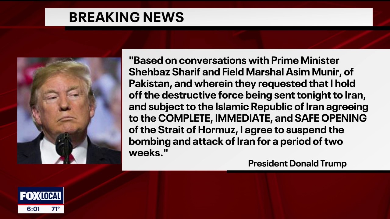 President Donald Trump said Tuesday he would pause planned U.S. military strikes on Iran for two weeks, citing talks with Pakistani leaders and a potential breakthrough toward a broader agreement, as long as Tehran agrees to immediately reopen the Strait of Hormuz.