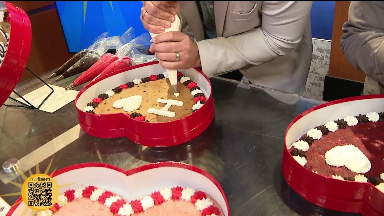 The Director of Training for Great American Cookie Dallas teach Paige Ellenberger and Steve Noviello how to decorate cookie cakes for Valentine's Day