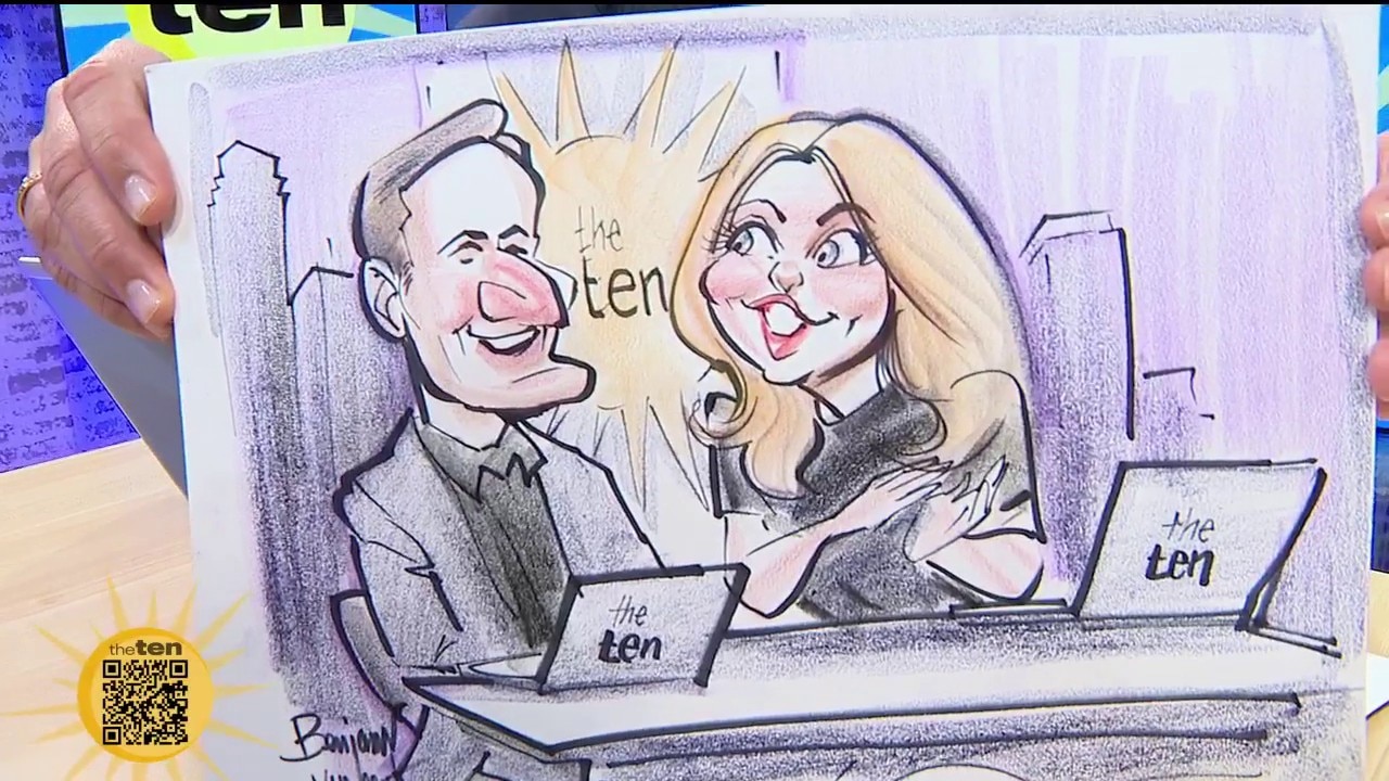 Caricature artist, Benjamin Vincent, teaches Steve Noviello and Paige Ellenberger how to sketch a caricature.