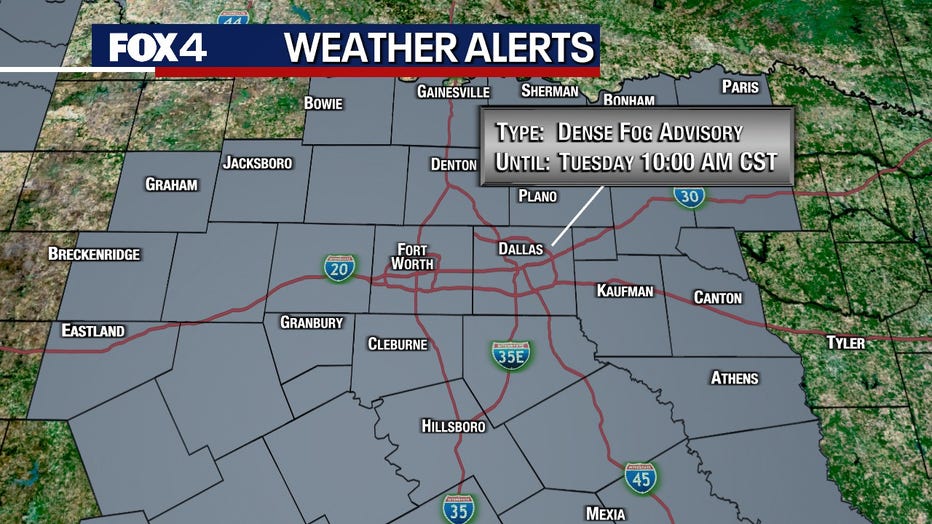 The National Weather Service issued a Dense Fog Advisory for dozens of north and central Texas counties until 10 a.m. That included Tarrant, Denton, Collin, Dallas, and Rockwall counties.