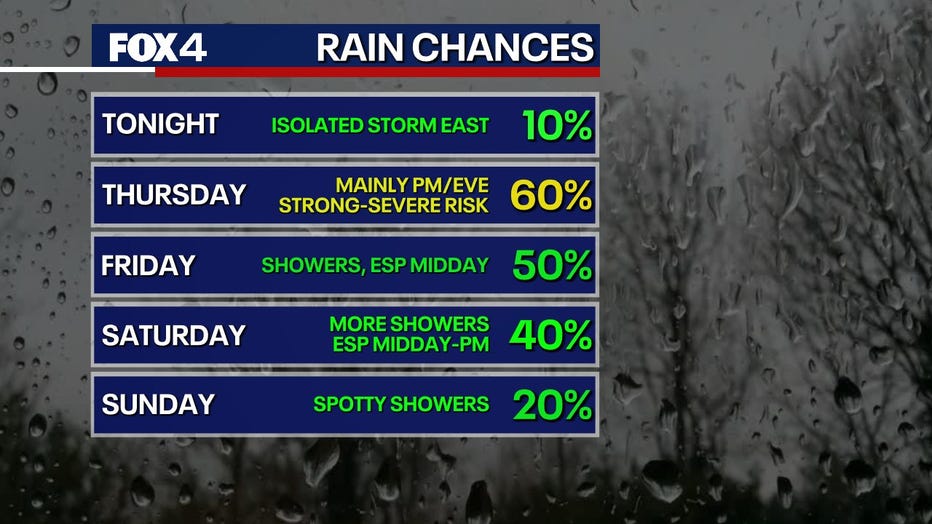 FOX 4 Weather Meteorologist Evan Andrews said rain chances linger into the end of the weekend. It will also be on the colder side later this week.