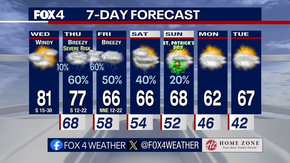 DALLAS - The warm, spring-like weather will turn to possibly severe thunderstorms later this week.