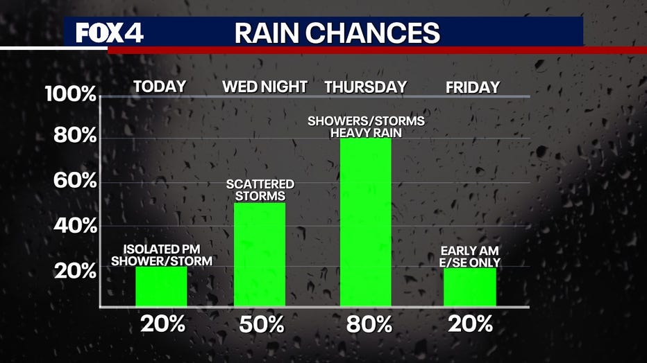 Overall, most areas in North Texas will see heavy rain. Storms will become widespread this evening and persist through the night, especially west of Interstate 35, according to NWS.