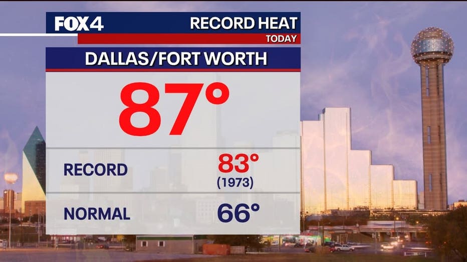 The week began with a new daily record high of 87 degrees on Tuesday at DFW Airport, breaking the previous record of 83 degrees. The average high temperature for this time of year is 66 degrees, according to the National Weather Service.